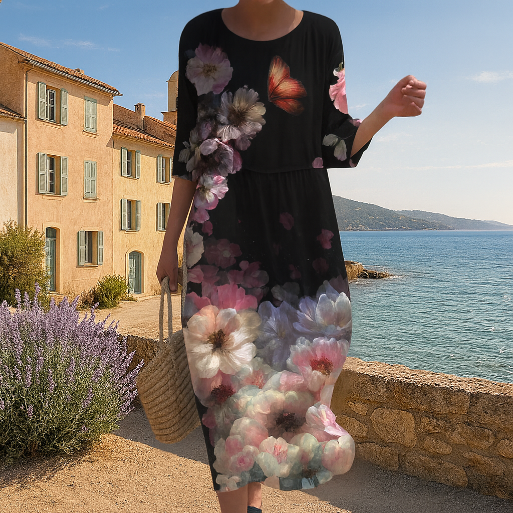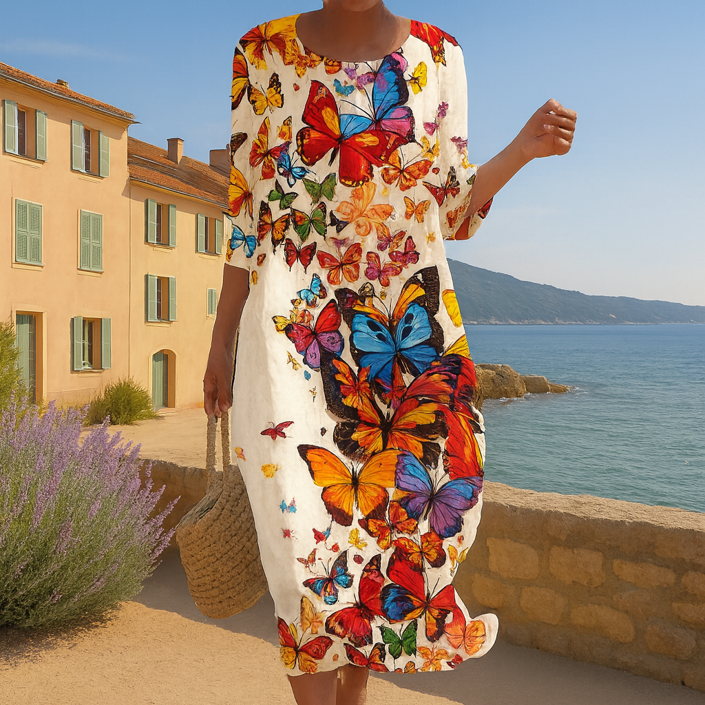 This long dress is made of a lightweight, breathable fabric that's perfect for warm days. The square neckline and relaxed fit create an elegant yet relaxed look. Perfect for a stroll along the beach, a summer lunch, or a night out.